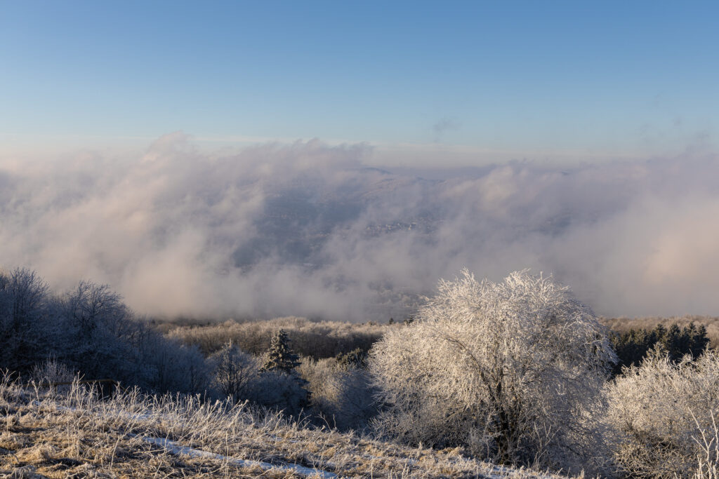 Nachdem der Satelittenfilm aufreissenden Hochnebel versprach, bin ich mit meiner Frau zum Kreuzberg gefahren. Nur, um zunächst im dichten Nebel durch die Gegend zu stapfen.
