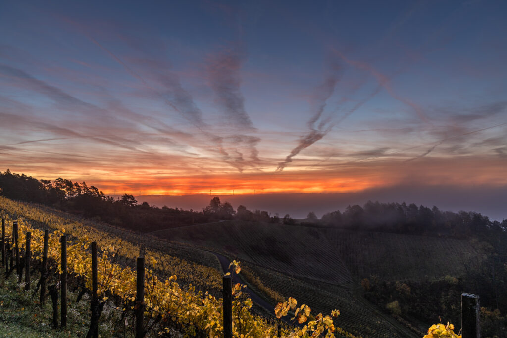 Heute, am letzten Tag des Monats, hat sich das Wetter aber nochmal richtig ins Zeug gelegt. Auf der Fahrt in die Weinberge hatte ich noch Zweifel, ob ich überhaupt über den Nebel komme, aber auf den letzten Metern zum Parkplatz sah ich schon das verheißungsvolle Morgenrot.