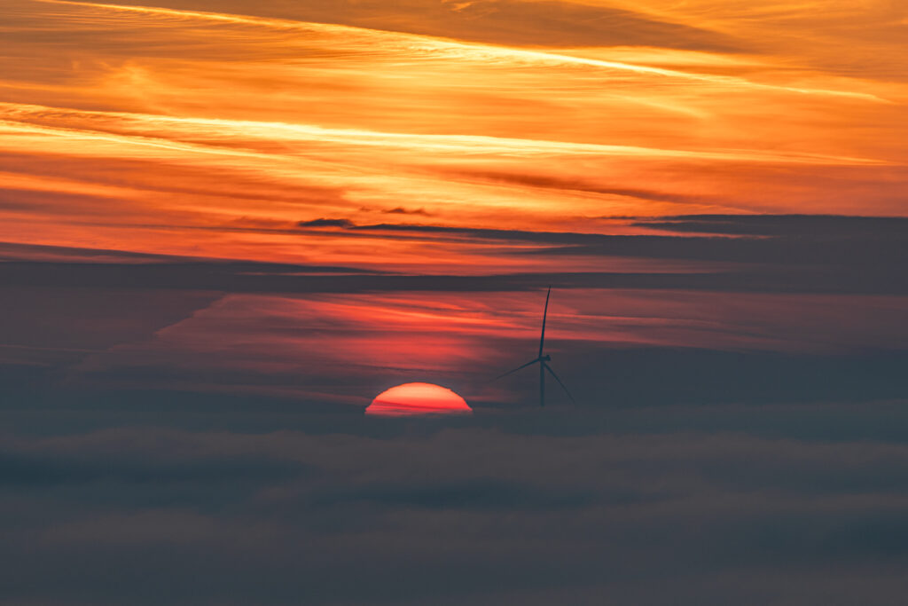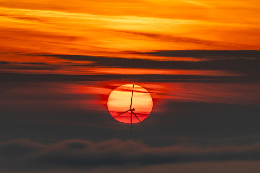 Nachdem ich erkannt hatte, dass die Sonne auf ihrem Weg über den Horizont hinter einem Windrad vorbeikommen würde, habe ich diesen Moment abpassen und mit idealen Bedinungen fotografieren können.