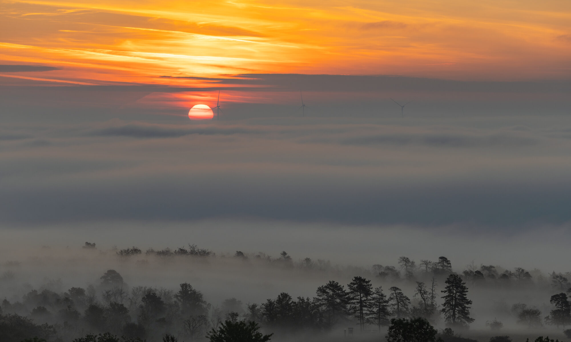 Nachdem ich erkannt hatte, dass die Sonne auf ihrem Weg über den Horizont hinter einem Windrad vorbeikommen würde, habe ich diesen Moment abpassen und mit idealen Bedinungen fotografieren können.